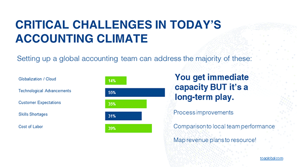 Build a highly skilled global accounting team and you can address a majority of these challenges. While you will gain the capacity you need, remember that this is a long-term play. You need to match this with the right accounting business strategies and how-to methodologies.