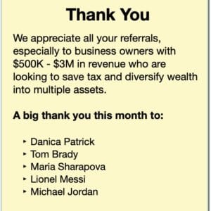 - Asking for referrals whenever you hit a “high point” in the relationship (e.g. after getting the client a big tax refund, helping them restructure etc.)